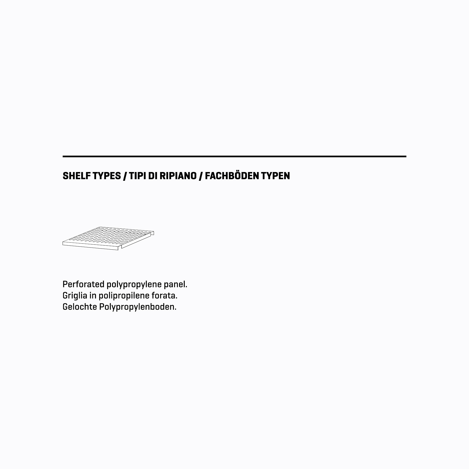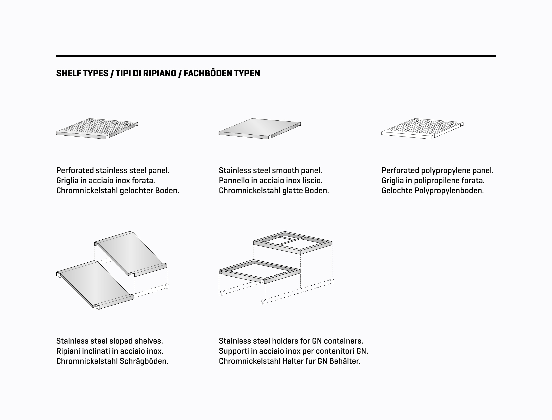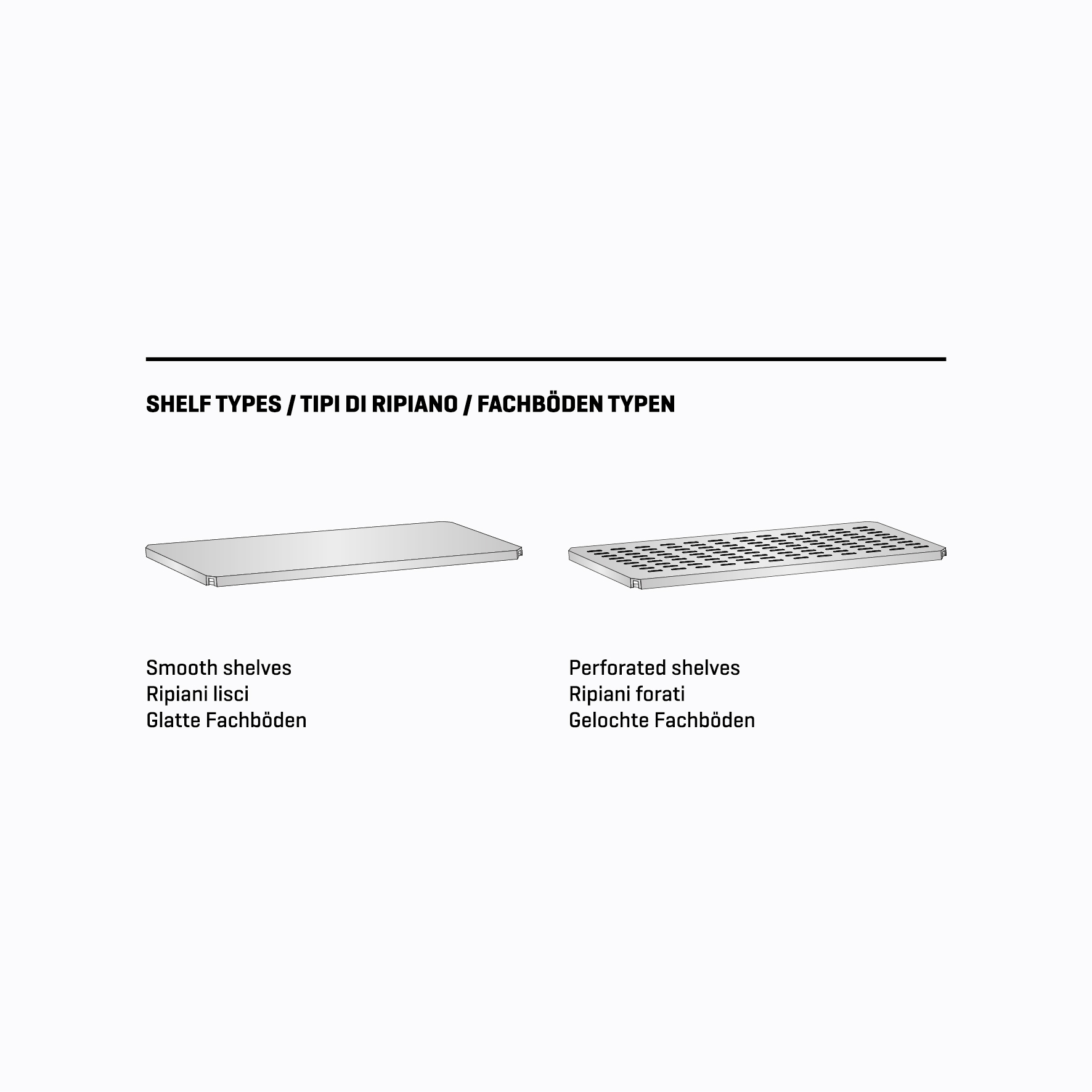 Scaffalature modulabili, componibili, realizzate con struttura portante in tubolare di acciaio inossidabile 18/10 e ripiani forati in polipropilene modulari per carichi normali. I Ripiani forati sono facilmente lavabili anche in lavastoviglie. Le scaffalature, dotate di piedini o ruote, possono essere completate con diversi accessori.
