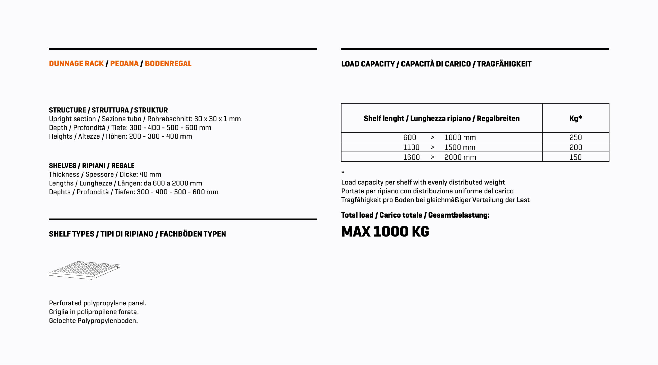 Scaffalature modulabili, componibili, realizzate con struttura portante in tubolare di acciaio zincato con verniciatura grigio chiaro (RAL 7035) atossica in polvere epossidica antigraffio con garanzia 10 anni sulla ruggine. I ripiani in polipropilene sono forati e facilmente lavabili anche in lavastoviglie. Soluzioni carrellate: su ruote girevoli, con o senza freno, per un facile spostamento.