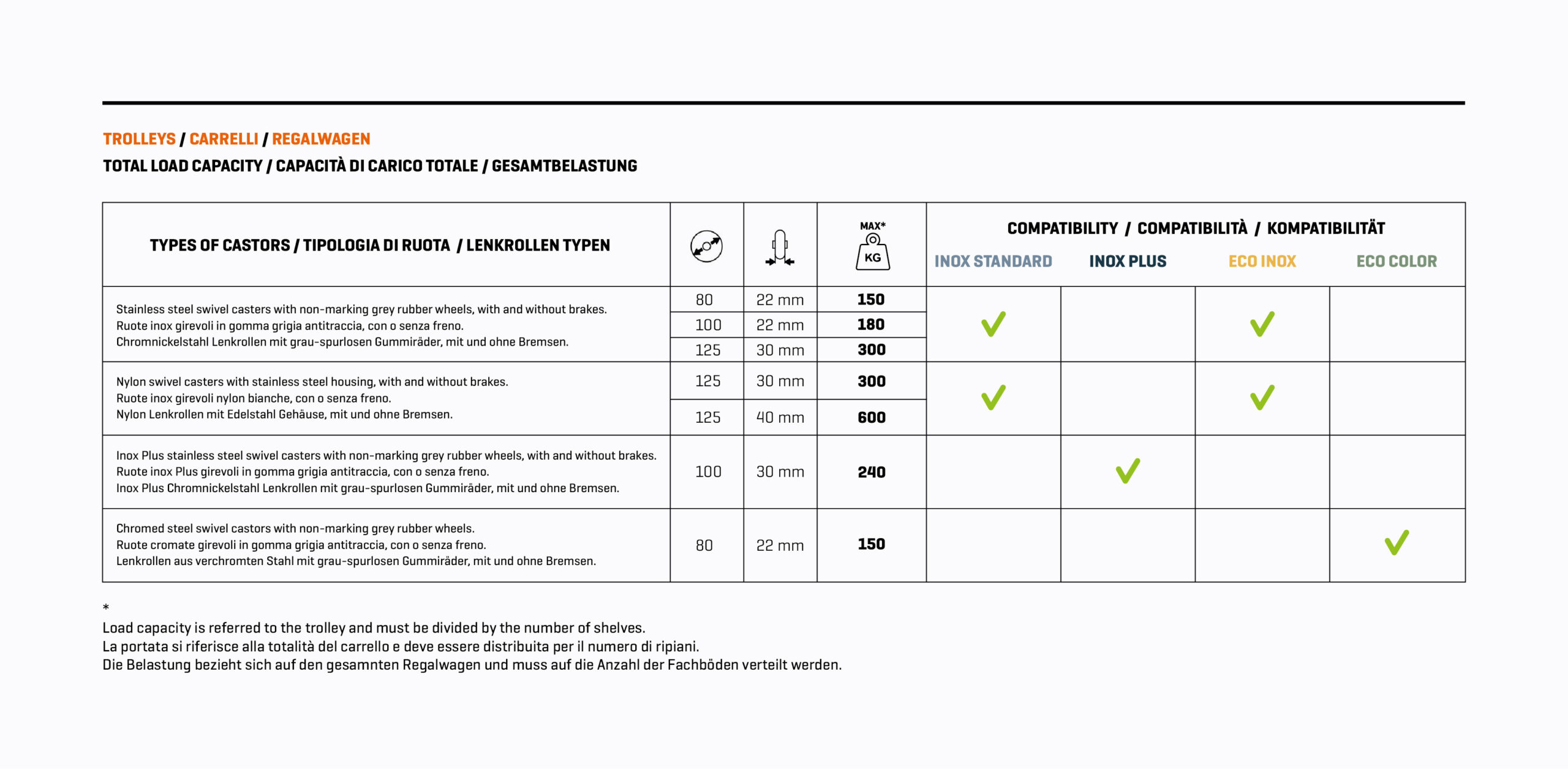Carrelli con telaio in acciaio inox AISI 304 e ripiani forati in polipropilene oppure acciaio inox AISI 304, conformi alla normativa HACCP. Ruote in acciaio inox antitraccia, Ø 125 mm, con o senza freno. Il sistema brevettato ad incastro conico auto-bloccante consente un montaggio rapido, con un solo operatore, senza viti ed utensili.