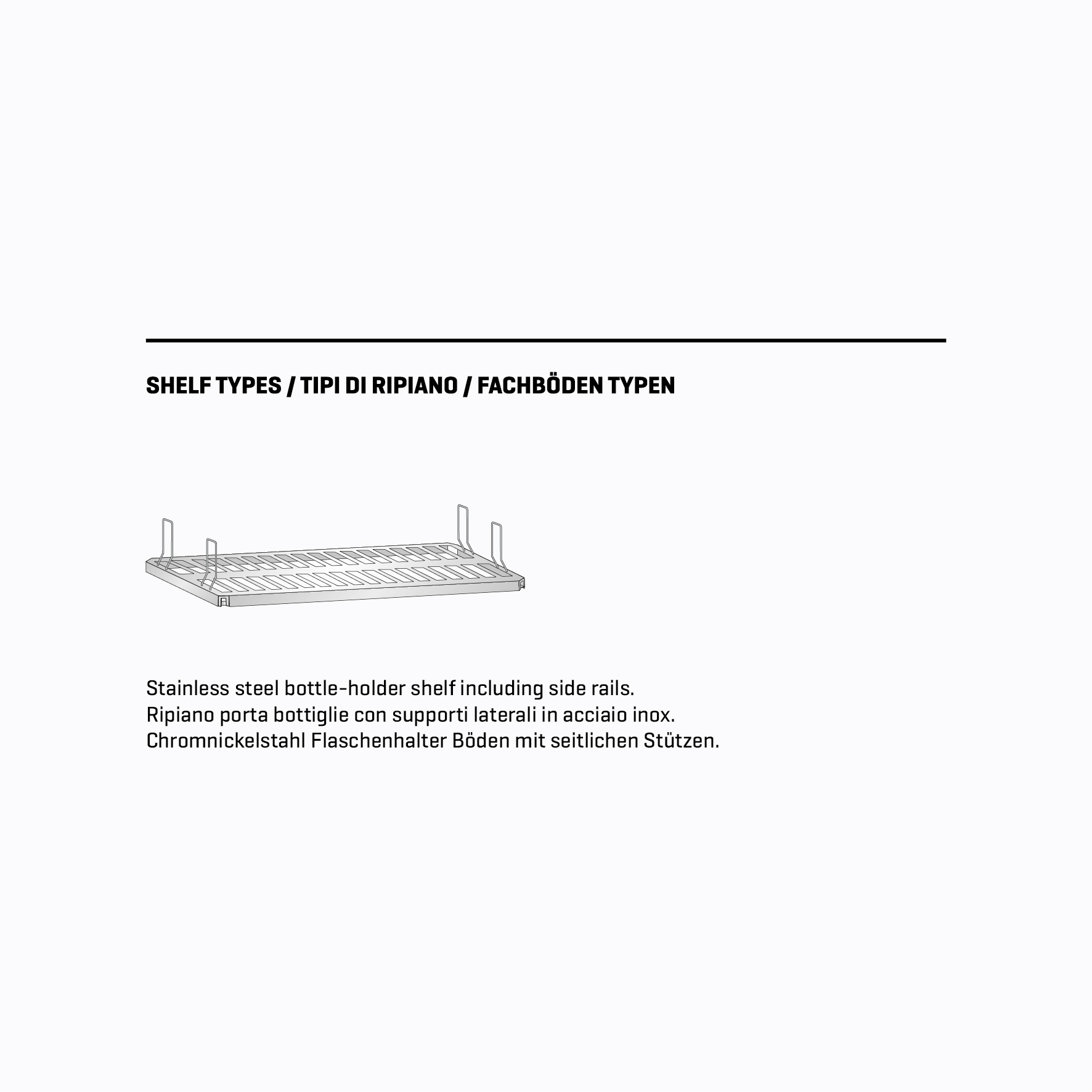 Modulare, robusto, facile da assemblare e da pulire, lo scaffale Eno Line è disponibile in varie dimensioni per soddisfare diverse esigenze di spazio e capacità. I ripiani, adatti ad ogni tipo di bottiglia, sono dotati di supporti in filo d’acciaio sagomati per proteggere le bottiglie da eventuali cadute. A richiesta sono disponibili inoltre porta etichette e separatori in acciaio inox per l’identificazione e la separazione tra varie tipologie di vino.